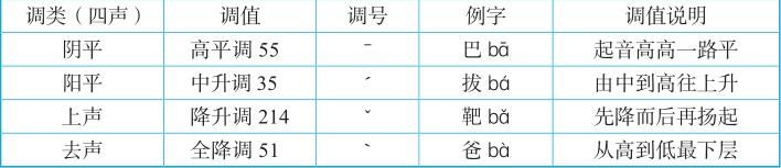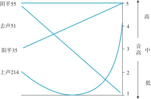 普通话有四个声调:阴平、阳平、上声、去声。调值常采用五度标记法标记(见图 3-1)。