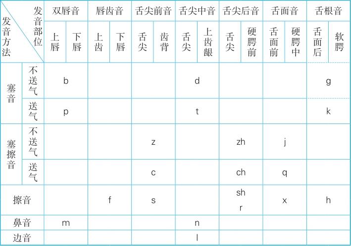 大家可参阅发音器官示意图(图1-1)来了解发音器官,参阅声母发音部位和发音方法简表(表1-1)来了解声母的发音部位和发音方法。