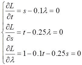 设拉格朗日函数为:L(s,t,λ)=ts+λ(1-0.1t-0.25s)。