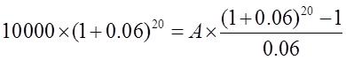 (2)设每次还A元,10年后银行借款及其利息和与还款者还款的现金在10年后的货币价值相等。即10000×(1+0.06) 20 =A(1+0.06) 19 +A(1+0.06) 18 +…+A。