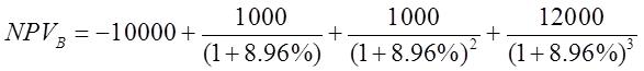 11 公司有两个互斥项目,初始投资都为10000万元,项目A的现金流为第一年10000万元,第二年为1000万元,第三年为1000万元,项目B的现金流为第一年1000万元,第二年1000万元,第三年为12000万元。公司的负债权益比为1∶4,公司债券的收益率为6%,假设无风险利率为4%,沪深300指数的收益率为10%,公司税为20%,公司β系数为1。