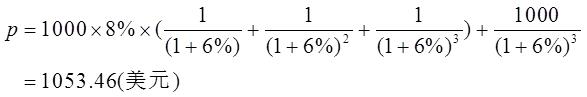 由60/1000份1年期贴现债券与1060/1000份2年期贴现债券组成的复制债券与1份附息债券在第1年和第2年的现金流完全相同,根据无套利均衡分析,两只债券的当前价格必然相等,因此有:(-P 3 )×(60/100)+(-P 1 )×(1060/1000)=-P 2 ,1000/(1+YTM 3 )=P 3