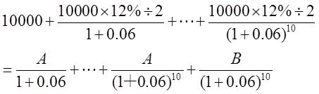 (2)设每次还A元,10年后银行借款及其利息和与还款者还款的现金在10年后的货币价值相等。即10000×(1+0.06) 20 =A(1+0.06) 19 +A(1+0.06) 18 +…+A。