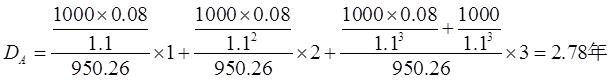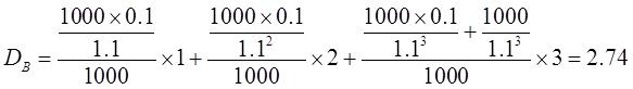 由于债券B的息票利率与当前市场利率相同,所以债券B的市场价格即为面值1000元,其久期为: