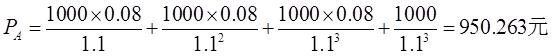 由60/1000份1年期贴现债券与1060/1000份2年期贴现债券组成的复制债券与1份附息债券在第1年和第2年的现金流完全相同,根据无套利均衡分析,两只债券的当前价格必然相等,因此有:(-P 3 )×(60/100)+(-P 1 )×(1060/1000)=-P 2 ,1000/(1+YTM 3 )=P 3 。