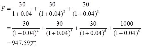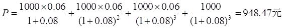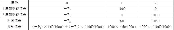 由60/1000份1年期贴现债券与1060/1000份2年期贴现债券组成的复制债券与1份附息债券在第1年和第2年的现金流完全相同,根据无套利均衡分析,两只债券的当前价格必然相等,因此有:(-P 3 )×(60/100)+(-P 1 )×(1060/1000)=-P 2 ,1000/(1+YTM 3 )=P 3 。