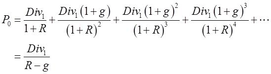 式中,g是增长率,Div 1 是第一年年底的股利,R为股东报酬率。
