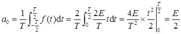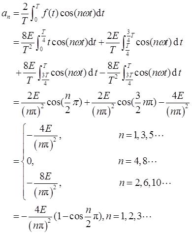 解: 由图3-2-2可知,f(t)为偶函数,其傅里叶级数不含正弦项,因此b n =0。