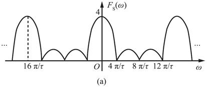 第一个零点ω=2π/τ,且T s =τ/8,ω s =2π/T s =16π/τ,所以冲激抽样后信号的频谱为: