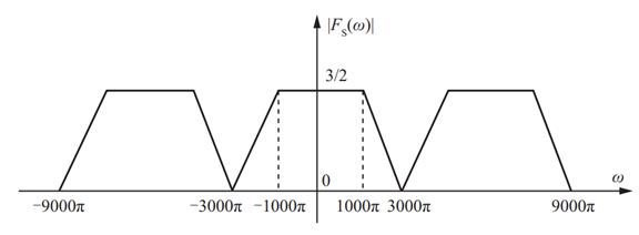 由此可知,最大角频率为ω m =3000πrad/s,从而最大抽样间隔T max =2π/2ω m =(1/3000)s。