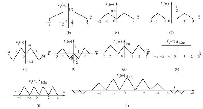 (2)若F(ω)图形如图3-2-46所示,当p(t)函数表达式为p(t)=cos(t/2)或以下各小题时,分别求F P (ω)表达式并画出频谱图;