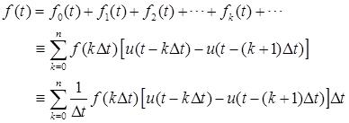答: 以冲激响应为例,这种分解思路是先把信号f(t)分解成宽度为∆t的矩形窄脉冲之和,任意时刻k∆t的矩形脉冲幅度为f(k∆t)。假设f(t)为因果信号,则f(t)可表示为
