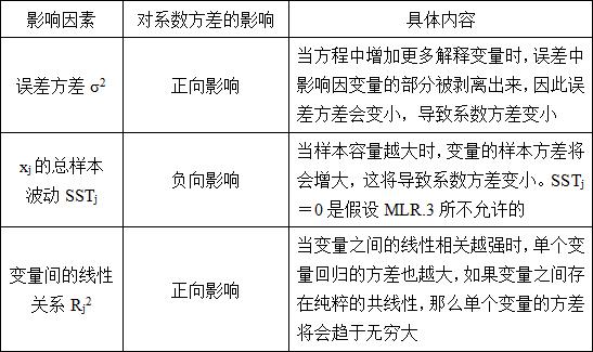 这是x j 的总样本波动,而R j 2 则是将x j 对所有其他自变量(包含截距项)进行回归所得到的R 2 。在这个公式的推导过程中,用到了所有高斯-马尔科夫假设。