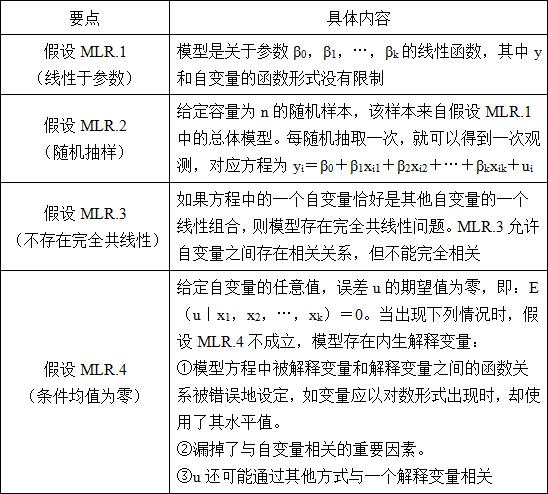 多元性回归模型的一般形式为:y=β 0 +β 1 x 1 +β 2 x 2 +β 3 x 3 +…+β k x k +u。其中,有k个自变量和一个截距项,涉及k+1个未知参数,一般将不同于截距的参数称为斜率参数。