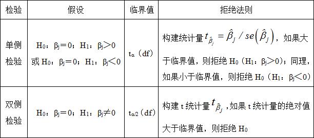 在CLM假设MLR.1~MLR.6下,( β j -β j )/se( β j )~t n - k - 1 =t df ,式中,k+1是总体模型中未知参数的个数(即k个斜率参数和截距β 0 ),n-k-1是自由度(df)。