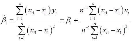 将y i =β 0 +β 1 x i1 +u i 代入 β 1 的表达式中,便可以得到: