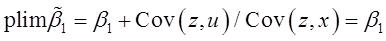 根据大数定律,分子和分母分别收敛于Cov(z,u)和Cov(z,x)。因为当假设MLR.4成立时,Cov(z,u)=0,所以有: