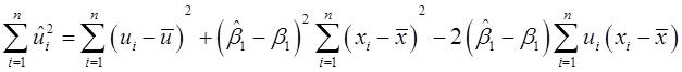 证明: u ( ) i =u i -( β ( ) 0 -β 0 )-( β ( ) 1 -β 1 )x i 关于所有i进行平均,可以得到:0= u ( _ ) -( β ( ) 0 -β 0 )-( β ( ) 1 -β 1 x ( _ ) 。两式相减可得: u ( ) i =(u i u ( _ ) )-( β ( ) 1 -β 1 )(x i x ( _ ) )。因此有: u ( ) i 2 =(u i u ( _ ) 2 +( β ( ) 1 -β 1 2 (x i x ( _ ) 2 -2(u i u ( _ ) )( β ( ) 1 -β 1 )(x i x ( _ ) )。对所有i求和,又得到: