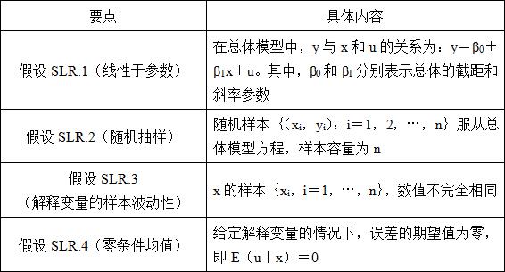 假定方程为:y=β 0 +β 1 x+u,若该方程在总体中成立,则它便定义了一个简单线性回归模型。模型将变量x和y联系起来,u是误差项或干扰项,表示除x之外的影响y的因素。β 0 和β 1 为待估参数,分别表示截距项和变量x的斜率。