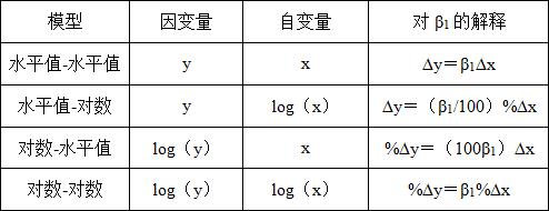 百分比影响(近似)为常数的模型形式为:logy=β 0 +β 1 x+u。特别地,若Δu=0,有:%Δy≈(100·β 1 )Δx。
