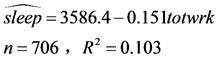 C3.利用比德尔和哈默梅什(Biddle and Hamermesh,1990)中的SLEEP75数据,研究在每周用于睡眠的时间和用于有酬工作的时间之间是否有替代关系。我们可以用它们中的任何一个作为因变量。为具体起见,估计模型sleep=β 0 +β 1 totwrk+u。式中,sleep是每周用于晚上睡眠的分钟数,totwrk是这一周中用于有酬工作的分钟数。