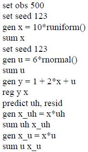 (i)首先生成解释变量x i ——取值区间为[0,10]的服从均匀分布的500个观测值。[大多数统计软件包有生成取值(0,1)的均匀分布的指令;将这些观测值乘以10即可。]x i 的样本均值和样本标准差是多少?