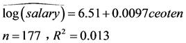 (iii)估计简单回归模型log(salary)=β 0 +β 1 ceoten+u,以通常格式报告结果。多担任一年CEO,预计年薪增长(近似)的百分数是多少?