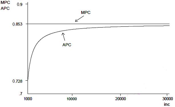 (iii)MPC和APC如图2-2所示。即使截距是负的,样本中最小的APC是正的。图中从年均收入水平1000美元开始。