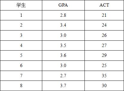 3 下表包含了8个学生的ACT分数和GPA(平均成绩)。平均成绩以四分制计算,且保留一位小数。