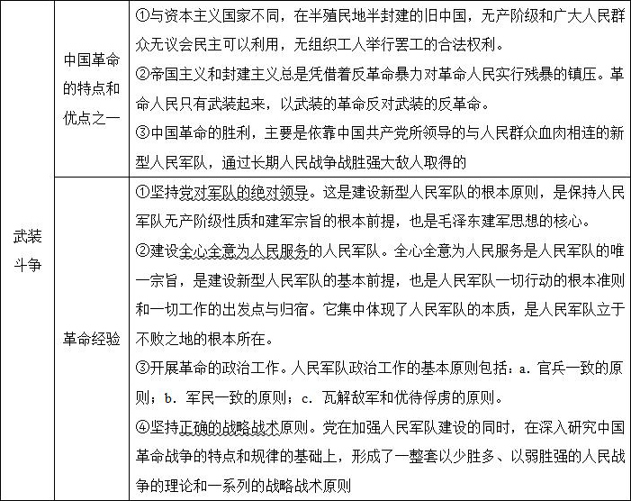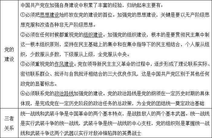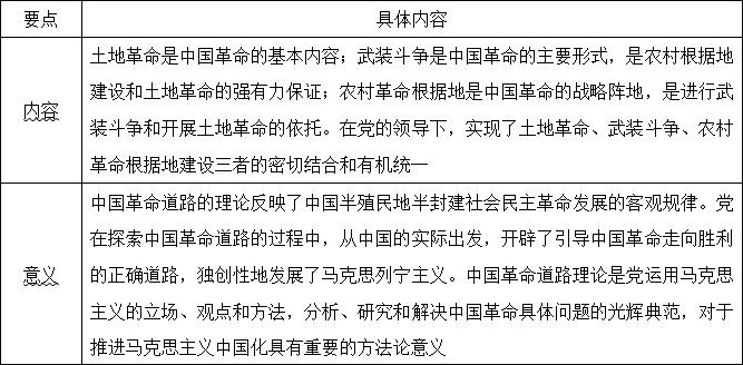 中国革命走农村包围城市、武装夺取政权的道路,根本在于处理好土地革命、武装斗争、农村革命根据地建设三者之间的关系。具体内容见表2-9。