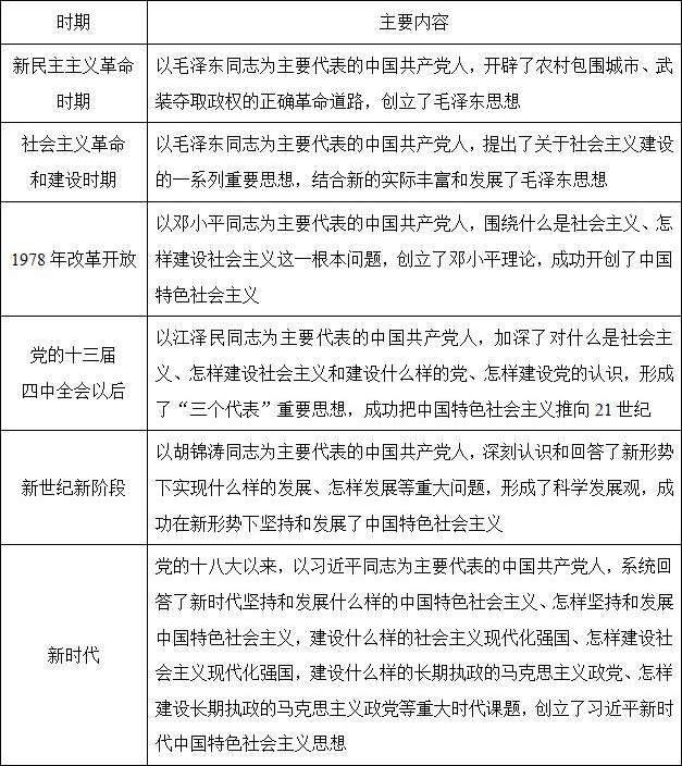 拓展: 中国共产党坚持以马克思列宁主义和毛泽东思想为指导,解放思想、实事求是、与时俱进,在建设和改革的实践中,逐步探索和回答了什么是社会主义、怎样建设社会主义,建设什么样的党、怎样建设党,实现什么样的发展、怎样发展等重大理论和实际问题,取得了一系列理论成果和实践成果——邓小平理论、“三个代表”重要思想、科学发展观以及习近平新时代中国特色社会主义思想等重大战略思想。