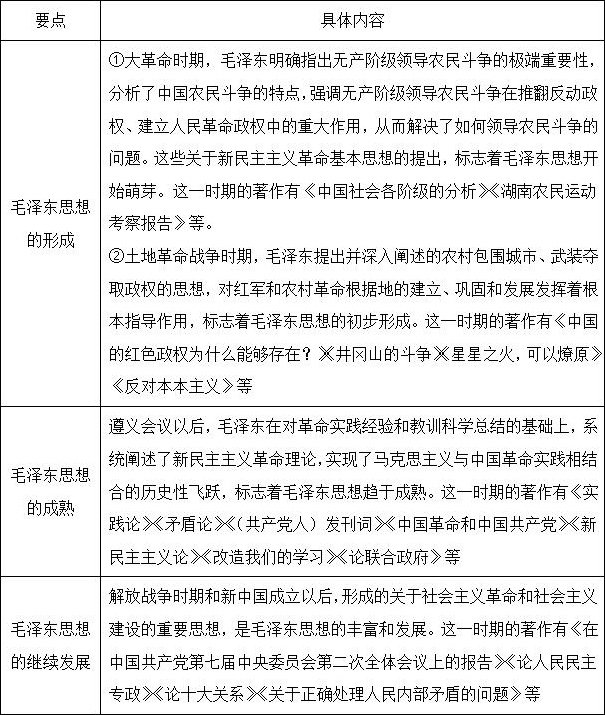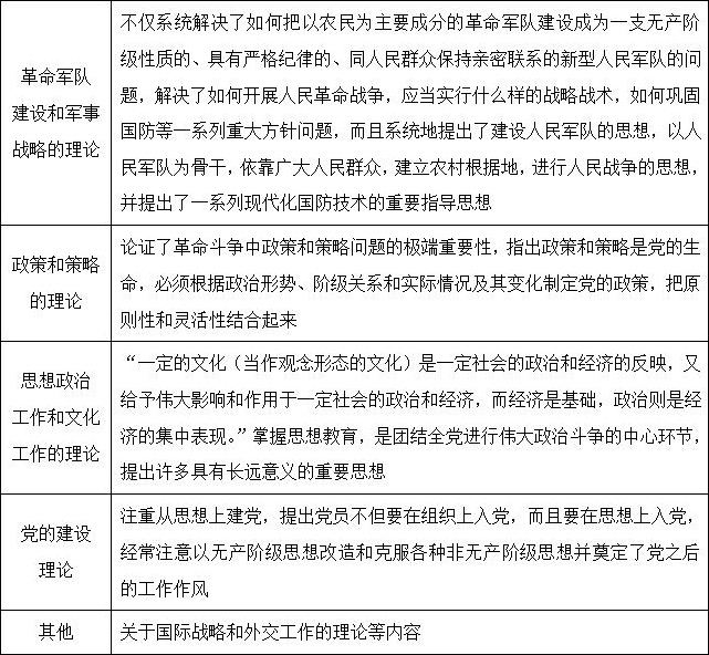 毛泽东思想在许多方面以其独创性理论丰富和发展了马克思列宁主义,成为一个博大精深的科学思想体系。其精髓是实事求是。其具体内容见表1-3。