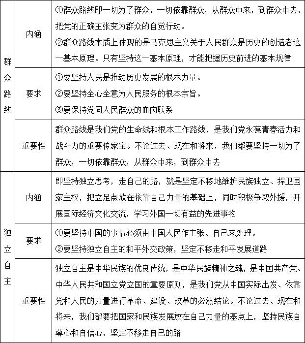 贯穿于毛泽东思想各个组成部分的立场、观点和方法,是毛泽东思想活的灵魂,它们有三个基本方面,即 实事求是、群众路线、独立自主 ,具体内容见表1-4。