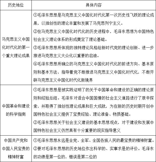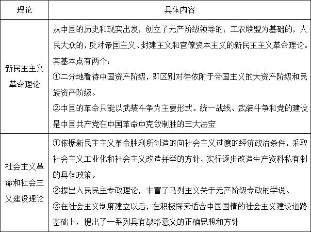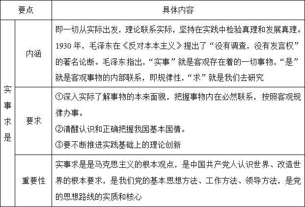 毛泽东思想在许多方面以其独创性理论丰富和发展了马克思列宁主义,成为一个博大精深的科学思想体系。其精髓是实事求是。其具体内容见表1-3。
