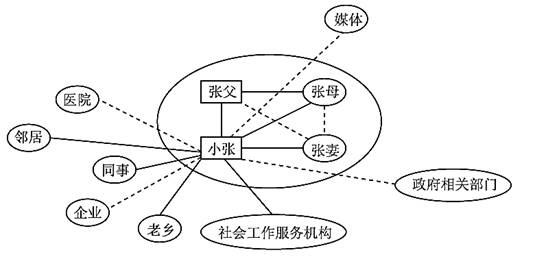 小张与大环境的关系总体较为疏离,只与社会服务机构的关系较为紧密,不能妥善处理与企业、医院、政府相关部门和媒体的关系,没能借助这四个渠道得到支持。