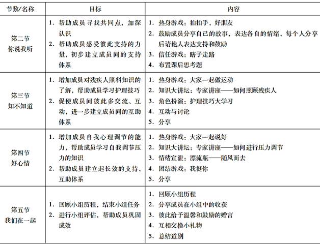 具体目标: 通过专家培训,提升残疾人照顾者的护理技能;通过小组内学习和训练,有效调节自我压力;通过小组活动,形成有效的相互支持和帮助网络。