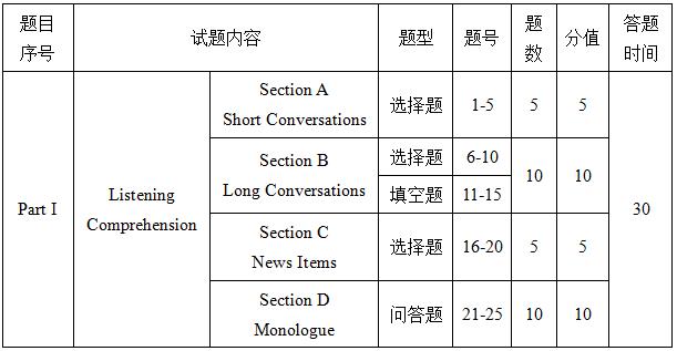 听力理解部分共30题,共计30分,时间30分钟。A类竞赛主要从四个方面来考查考生的听力理解能力:短对话、长对话、短新闻、独白。