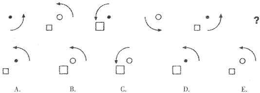 【解析】 根据给出的图形可以看出各图形有一定的排列规律:其中箭头依次逆时针旋转90度,实心圆圈与空心圆圈交替出现,大四方形在小四方形之后出现,依此可得出下个出现的图形是B。