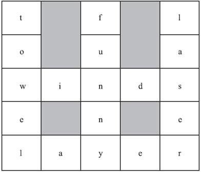 【解析】 根据所给字母a可知,最后一行单词为layer或laser,如果填入laser,那第三列最后一个单词为s,故第三列单词为winds,所以第一行第三个字母为w,由此可知,第一行的单词为towel,t因此位于一行一列,可知需要两个以t开头的单词,不符合题目要求,故排除。所以最后一行为单词layer。所以一列最后一个字母为l,故第一列的单词为towel。第三列最后一个字母为y,故第三列单词为funny。最后一列最后一个字母为r,故最后一列单词为laser。因此剩下第三行的单词为winds。