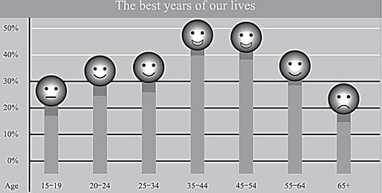 A research organization did a survey to find out who are the happiest people in Britain. They interviewed over 5,000 people. Here are the results of the survey. At what time in their lives are British people happiest? When are they least happy? What are the probable reasons?
