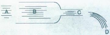 94 A large volume of water is gushing through a pipe which narrows at the outlet. At which point, A, B, C, or D will the water flow fastest?