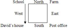 96 David’s house is west of the post office and south-west of the farm. The farm is due east of the school. The school is north-west of the post office. These four places form the points of a square. Where is David’s house in relation to the school?