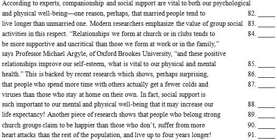 (属于大型宗教团体的人会更快乐,比一般人能多活四年,由此可推测这类人应当更少患病。因此more不符合文意,应改为fewer。)