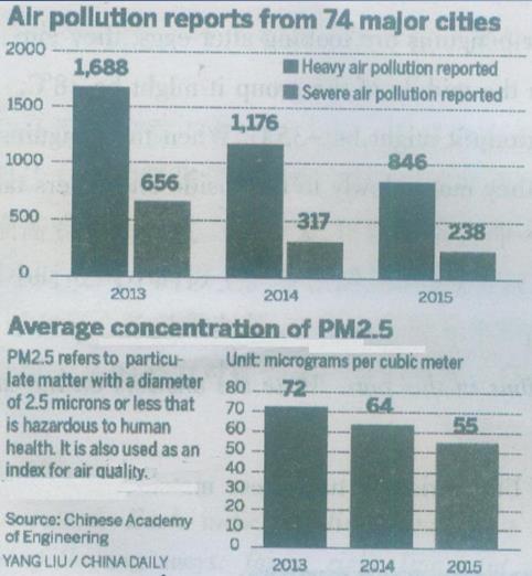 According to the charts, in general, the air pollution keeps decreasing from 2013 to 2015 among 74 major cities in China. 2013 saw the most serious air pollution, with 1688 heavy air pollution reported and 656 severe ones. The PM2.5 index, being 72 micrograms per cubic meter, is also the highest in the three years. But the number of air pollution reports, as well as the PM2.5 index, gradually drops, reaches the lowest in 2015. What’s more, among the heavy air pollution, the ratio of severe air pollution reported also declines year by year. From the two charts, we can see that the measures taken to deal with air pollution finally come into effect, which is a good phenomenon.
