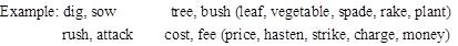 【解析】 给出的例子中plant可以作名词,意思是“植物”,与给出的tree和bush同一类;plant也可以用作动词,意思是“种植”,与给出的dig和sow同一类。问题项给出的词中charge,可作动词,意思是“控告;起诉”;也可作名词,意思是“要价;收费”。)