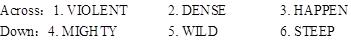 【解析】 横向1已给出,突破口在有共同字母的纵向4和5。纵向5,由提示“自然状态下的地区”结合第二个字母i,得出wild。由横向2首字母d,结合给出提示树木紧密生长在一起,得出dense。依次推出单词6、3、4。