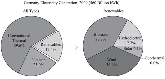 Look at the charts below. The pie charts show the electricity generated in Germany and France from all sources and renewables in the year 2009. Summarize the information and report the main features, and make comparisons where necessary.