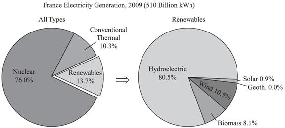In France, the total volume of generated electricity is 510 billion kWh. Among all the generating ways, nuclear accounts for 76% and conventional thermal makes up for about 10%, while renewables account for about 13.7%. In renewables, four fifths is hydroelectric and 10% is wind. Biomass accounts for about 8%.