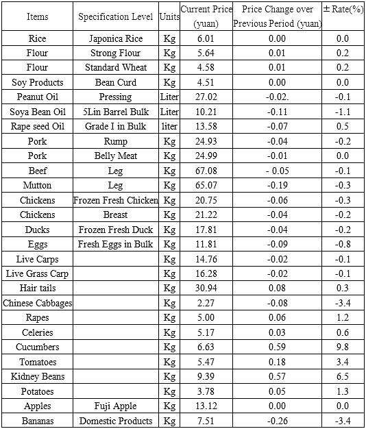 The six aspects are items, specification level, units, current price (yuan), price change over previous period (yuan) and rate. As it revealed, almost half the price increases while the other half decreases, but generally speaking, most of the items didn’t change a lot in terms of price, some even kept the same. However, few of them cost quite differently comparing to the past. For example, cucumber used to sell 6.63 yuan while now it increases 0.59 yuan with price rate as 9.8%, which is the highest rate among all those items.