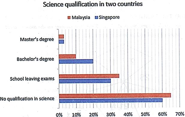 The chart shows the percentages of people with different education backgrounds in science qualification in Malaysia and Singapore.